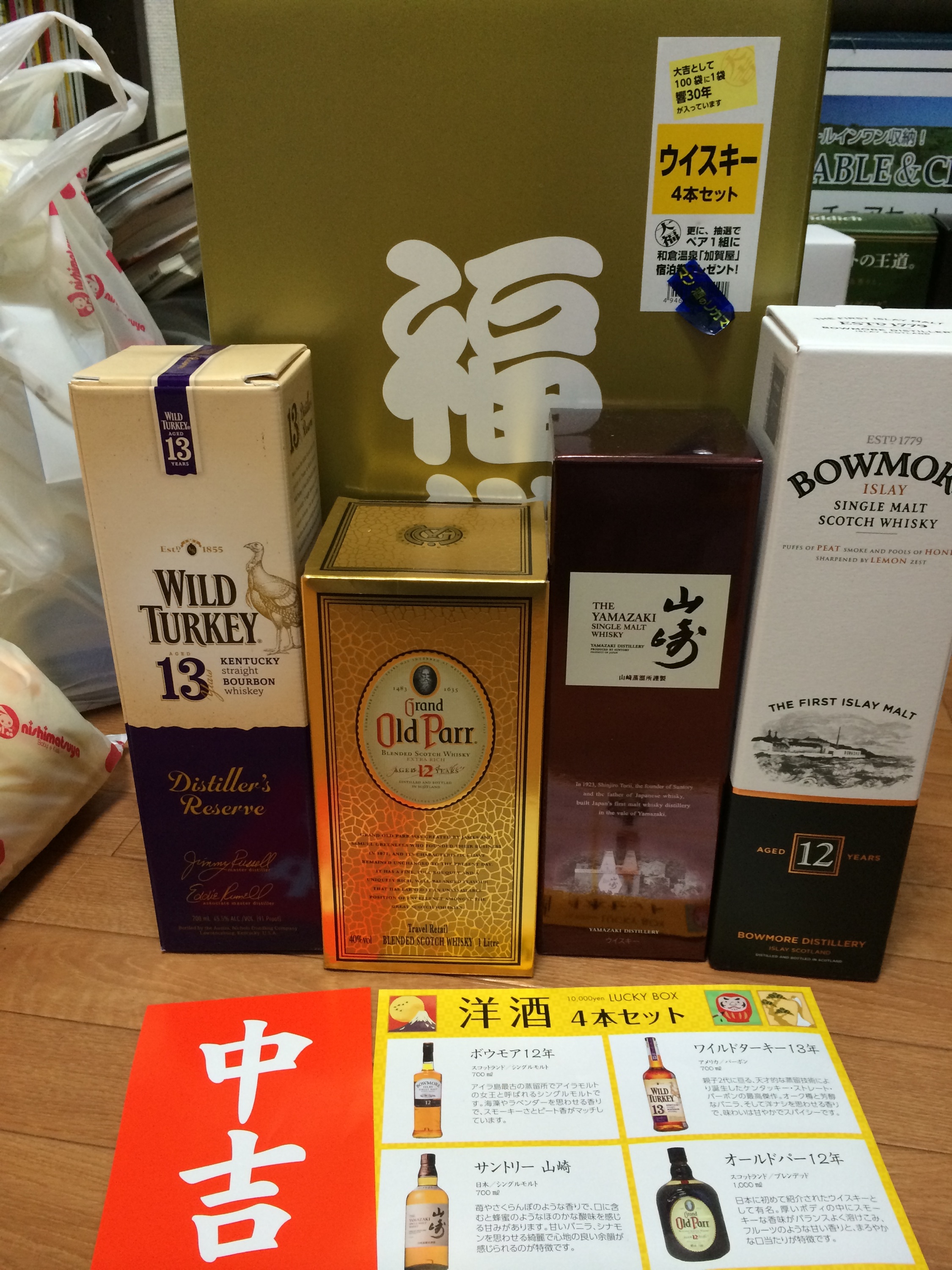 10000円で四本入りなら、一本あたりいつも買ってるやつと同じくらいやで? 買えばえぇやんか。 と、ソソノカシ。 もとい、背中を押して。 福袋(福箱)を、買わせました。 いいんだよ、納得してたんだから。 我が家のストックと、二本ダブったようです。 どうせ飲むんだから、気にしないキニシナイ!! 好きでしょ、山崎もボウモアも。 ちなみに。 定価からみたら、5000円程お得だったようです。 よかったよかった♪ まもなくクリスマス、ときどき、イブ。イブですが、なんもなし。