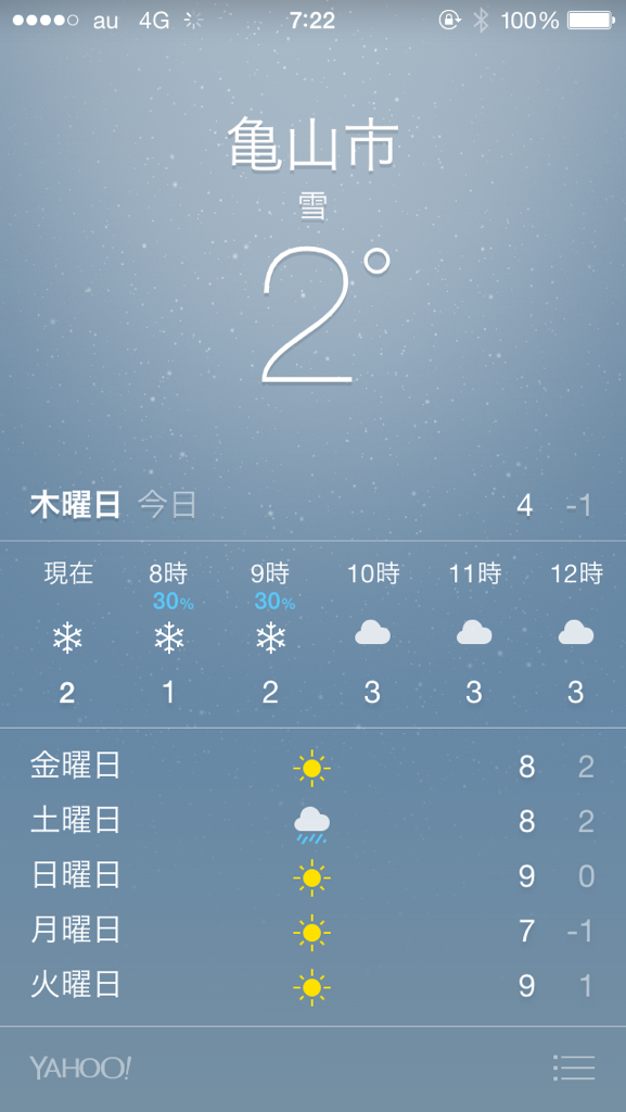 雪、です。 降ってます。 積もってきてます。 明日朝が、楽しみだー♪ …寒さ以外。 雪マーク、ときどき、快晴。 |